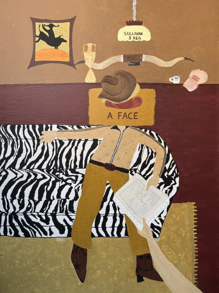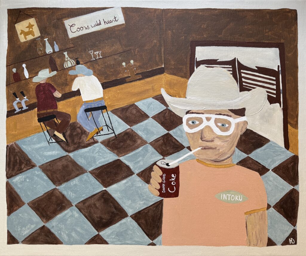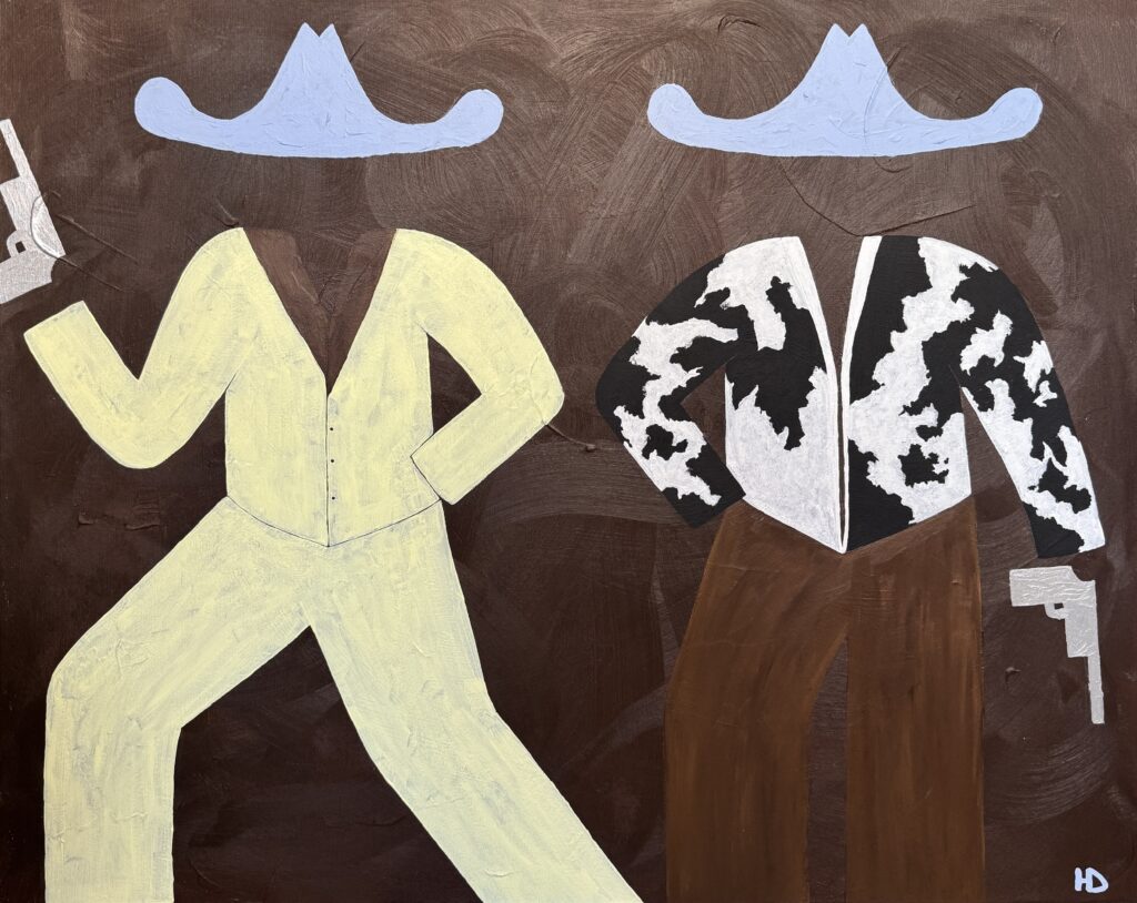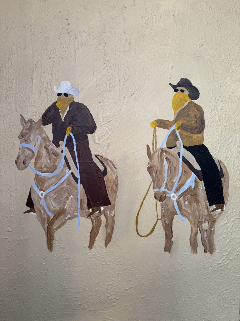 De starka färgerna som dominerar mina målningar är ett sätt för mig att “ta plats”. Något jag aldrig aktivt har strävat efter, men som jag alltid fått höra att jag saknar. Genom mina målningar låter jag mina cowboys och deras högljudda uttryck ta den platsen. Färgerna representerar en kraft och närvaro som talar för mig, och förmedlar det jag alltid fått höra att jag inte har.“