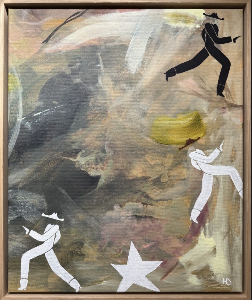 “Hannah Davies akrylmålningar har ofta cowboys som motiv. Hattar och stövlar är deras kännetecken och ibland viftar de med revolvrar. Men deras armar och ben verkar vara gjorda av gummi. Har de någon ryggrad över huvud taget? Hannah Davies målar stora fält med pastellfärger eller svartvit mot guld bakgrund. Detta förstärker ytterligare krocken med cowboyschablonen.